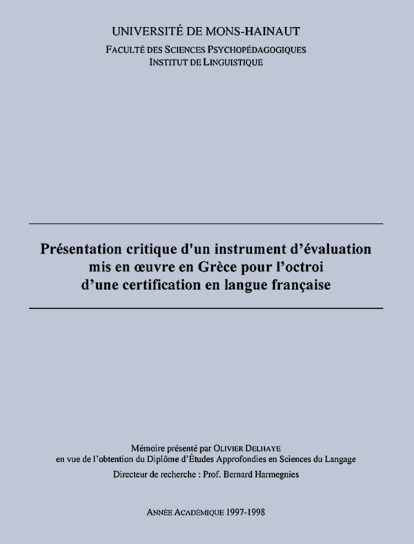 L’objet précis de cette étude sera donc la présentation critique et non contrastive d’un instrument d’évaluation utilisé en Grèce pour la délivrance à l’échelle nationale de certifications de bonne connaissance de la langue française. Cet instrument a été créé en 1984 par le prof. Vasso TOCATLIDOU pour le compte de la PAnhellenic federation of Language School Owners (PALSO). Depuis mai 1987, nous participons à la conception et à l’amélioration de cet outil en exploitant notamment les informations fournies annuellement par la correction des épreuves et par l’analyse des résultats. Présentation sera donc également faite de cette autocritique itérative qui fait partie de l’instrument lui-même puisqu’elle en améliore, d’une session à l’autre, le degré de pertinence et de fiabilité par de constants va-et-vient entre les résultats et les tests qui les engendrent.