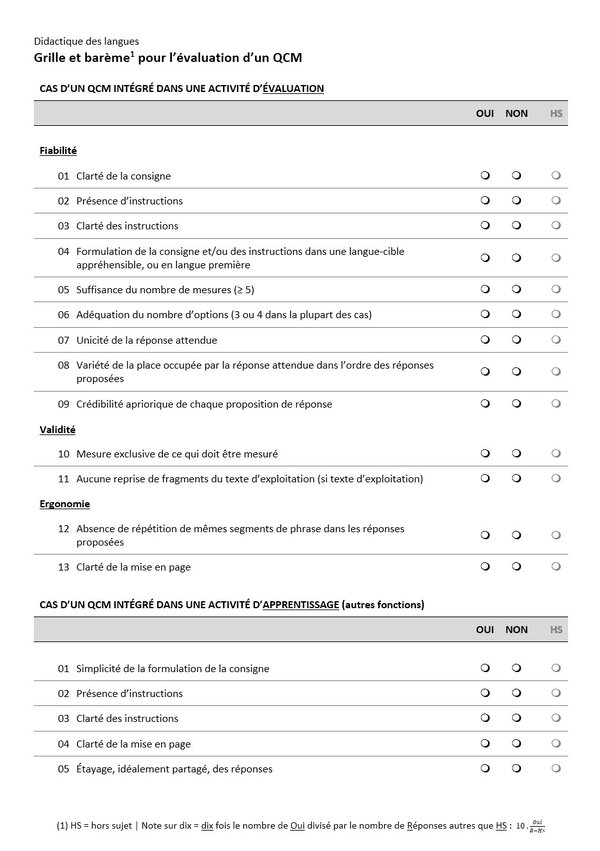 Voici une grille, assortie d’un barème, qui permet d’évaluer le QCM que vous êtes en train de construire ou ceux auxquels nous sommes parfois exposés :