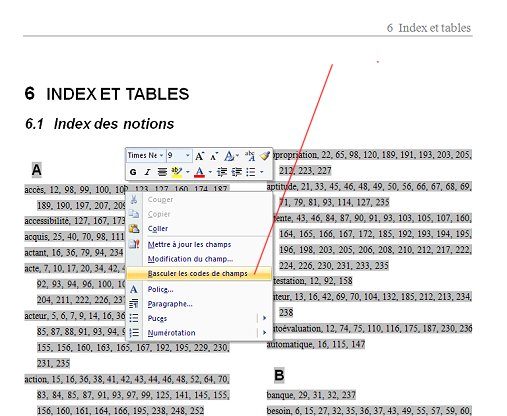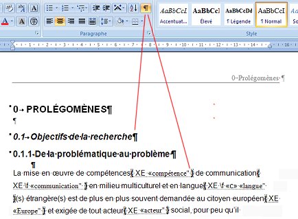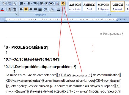 Dans la figure qui précède (fig. 4), le mot compétences est suivi du code {XE "compétence"} qui signifie « à indexer sous l’entrée compétence ».