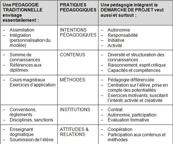 En témoigne ce tableau, emprunté à Charentier, Collin & Scheurer [2], qui énumère les bienfaits d’une pédagogie du projet.