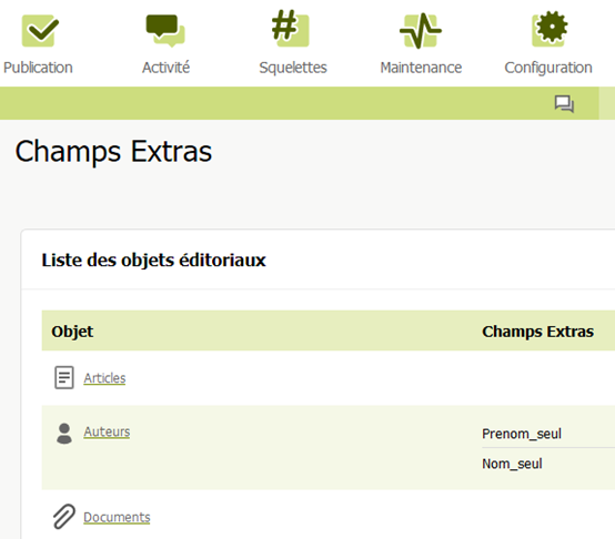 Le plugin Champs Extras permet de personnaliser les champs des objets éditoriaux (articles, auteurs, etc.). Ici, nous utiliserons ce plugin pour ajouter deux champs : Prenom_seul et Nom_seul. Ces champs permettront de structurer les informations des auteurs dans une boucle qui générera automatiquement la référence bibliographique au format APA7.