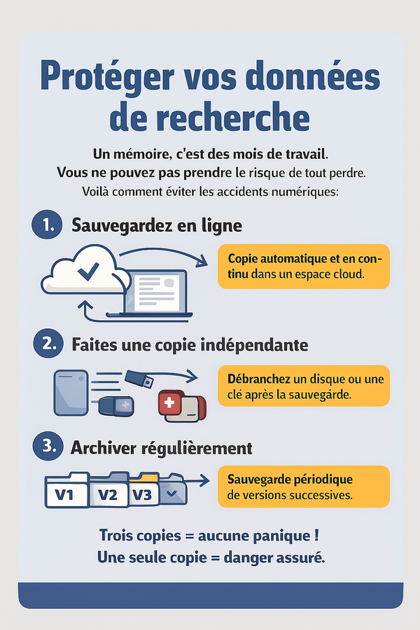 Votre mémoire sera évalué sur son contenu, mais aussi sur la rigueur de sa démarche. Protéger vos données n’est pas une tâche technique, mais une tâche académique. C’est une manière de montrer que vous traitez votre travail comme un projet scientifique, pas comme un devoir scolaire.