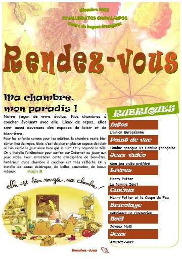 Κατά τη διάρκεια της περσινής χρονιάς αλλά και της φετινής προσπαθήσαμε με όλους τους μαθητές του φροντιστηρίου που μαθαίνουν Γαλλικά, να φτιάξουμε μια εφημερίδα στα γαλλικά. Τυπώνουμε τρία τεύχη το χρόνο, Χριστούγεννα, Καρναβάλι και Πάσχα. Την « αρχισυνταξία » και κατασκευή την έχω αναλάβει η ίδια, φυσικά με την ηθική και οικονομική υποστήριξη του φροντιστηρίου όπου εργάζομαι τα δύο τελευταία χρόνια.
