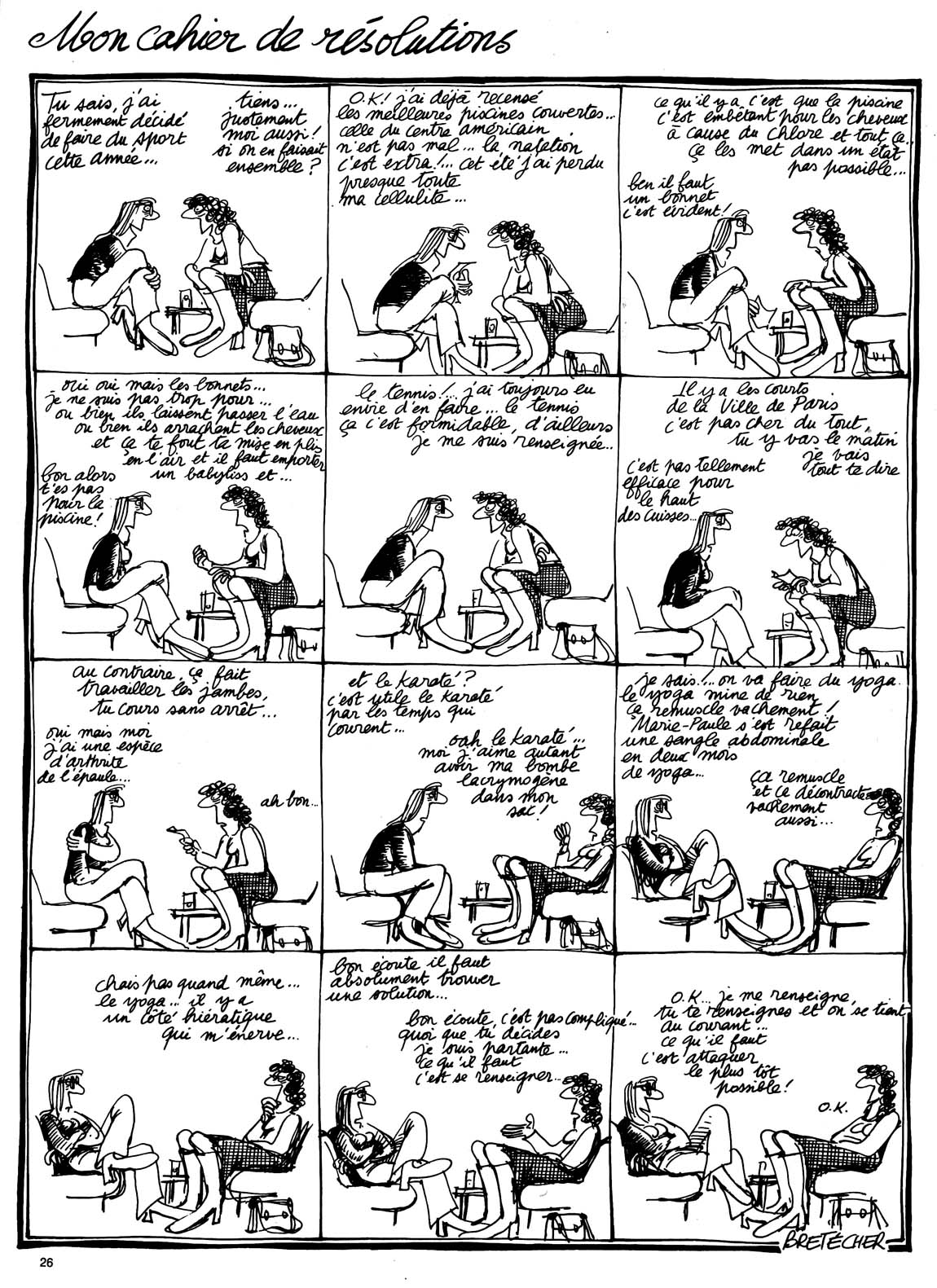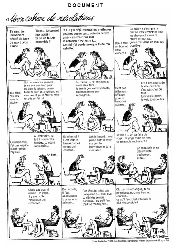 Comment a-t-on pu abîmer ainsi un document qui sentait certes le moisi (Nos élèves étaient-ils seulement nés en 1983 ?) mais qui aurait par exemple pu permettre de mettre nos apprenants au contact de l’écriture manuscrite ou de l’humour de Bretécher. Parce que même cet humour, les conditions de reproduction l’ont tué. Qui a ri en lisant cette planche ? Peu de gens. Pourquoi ? Parce qu’il manque justement cette écriture manuscrite si caractéristique (absence de majuscules, alinéas significatifs, etc.), les détails savoureux (justement ceux qui ont été escamotés : le babyliss à emporter, se refaire une sangle abdominale en deux mois en faisant du yoga !) et une indication claire des tours de parole (le seul fait de placer une réplique plus haut dans une case ne suffit pas à s’assurer de ce que les lecteurs la liront en premier).